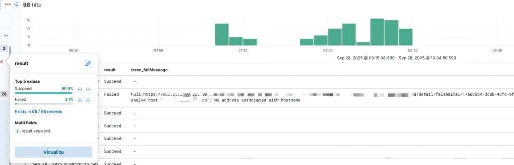 从ES集群查看APP上报的异常log,发现出现DNS No address associated with hostname的用户不是一直失败,一个用户使用同样的IP请求同一个接口,出现这种异常的情况占比达到3%。