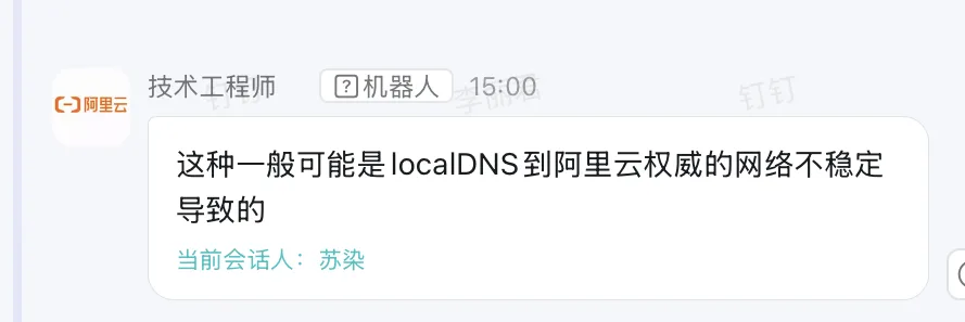 联系阿里云技术同事帮进行排查,结合DNS解析日志和深度分析,以及排查阿里云海外的DNS缓存服务器日志,初步判断目前是用户localDNS到阿里云权威的网络不稳定导致的。