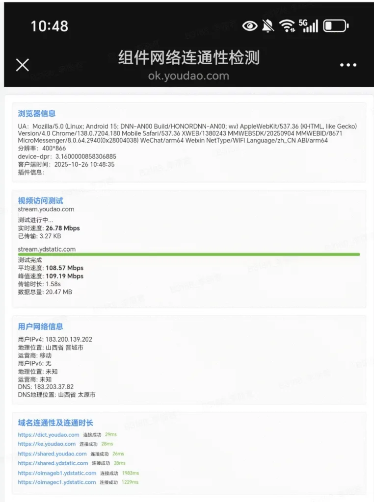 有些时候会遇到某个地方的用户查看视频出现卡顿,在同网络下访问组件网络连通性检测页面能看到访问stream.youdao.com实时速度很低,并且已传输数据量很小,如下图: