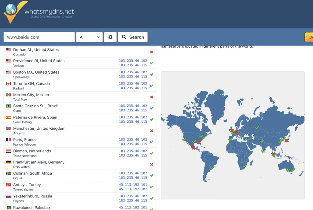 新加了一个域名主机记录,要看一下全球各地的生效结果,可以从下面三个检测地址来查看: